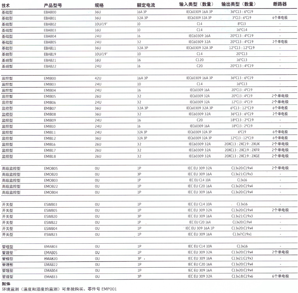 开关型ePDU斌予了数据中心管理人员全面的控制能力。它们能够远程关闭或重启设备,确保它依照正确的延迟顺序启动,并且全面监控负载均衡。监测管理型ePDU为数据中心管理人员提供最多的功能和最大的灵活性,而且可以完全清楚及全面控制数据中心配电。开关高准确度的单个插座、用户定义插座组、支路和全面的ePDU监测(包括千瓦时,电压,功率和电流,高于2安培时准确度为l% )通过可选传感器监测机架内温度和湿度。控制通过以太网或机柜上的高级LCD屏,实现远程监测和控制。通信协议包括HTTP/HTTPS、 DHCP 、 SNMP vl和v3 、 SNTP 、 SMTP 、 Telnet 、 IPv4 和 IPv6 。支持批量配置和升级。采用伊顿专利的灵活安装系统,可以确保ePDU安装到任何标准IT机柜中。伊顿可管理型ePDU可以在60℃以下的条件下,提供稳定的配电服务。兼容思科EnergyWise。技术参数